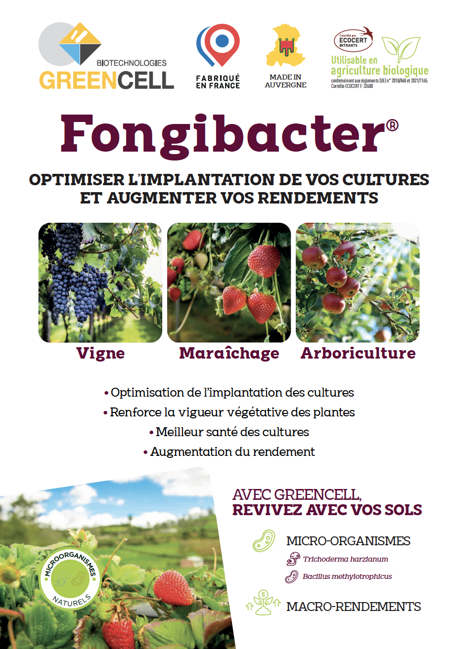 FONGIBACTER® (biofertilisan) : amplifie la flore microbienne, renforce la vigueur végétative, essentiel pour la vigne, l’arboriculture et le maraîchage.