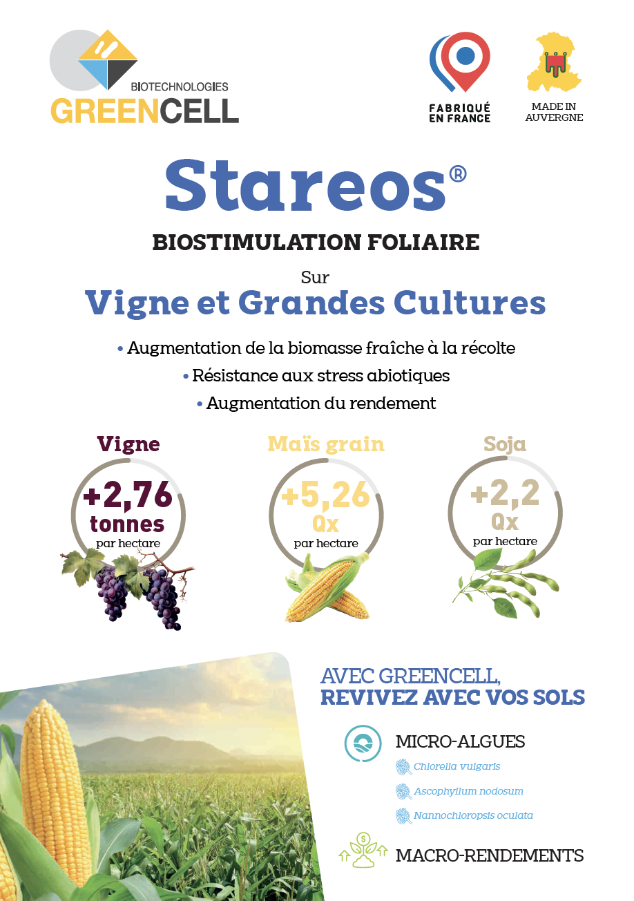 STAREOS® est né de l’association complémentaire de macroalgue brune (Ascophyllum nodosum), de microalgue verte (Chlorella vulgaris) et de microalgue brune (Nannochloropsis oculata). Ces extraits d'algues constituent un produit liquide riche en protéine, vitamines, acides gras insaturés, minéraux, acides aminés et phytohormones. Les essais réalisés montrent une augmentation de rendement, de biomasse fraîche à la récolte et de résistance au stress hydrique. STAREOS® est un biostimulant particulièrement adapté aux cultures maraîchères, arboricoles et viticoles.